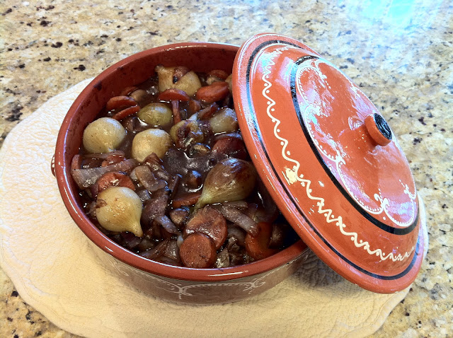 Boeuf Bourguignon, também conhecido como ‘boeuf à la bourguignonne’, é um tradicional cozido frances preparado com carne refogada em vinho tinto, e aromatizado com alho, cebola, cenouras, ervas e guarnecida com cebolinhas brancas e cogumelos. O prato foi popularizado no livro de Julia Child denominado ‘Mastering the Art of French Cooking’, e foi mencionado com destaque no filme ‘Julie & Julia’, baseado no livro de Julie Powell, com Meryl Streep no papel de Julia.