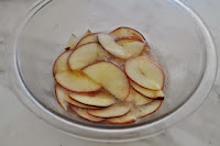 - Em uma bacia grande coloque as maçãs fatiadas e misture o suco de limao, açúcar, açúcar mascavo, farinha de trigo, canela em po e noz moscada. Misture delicadamente.
